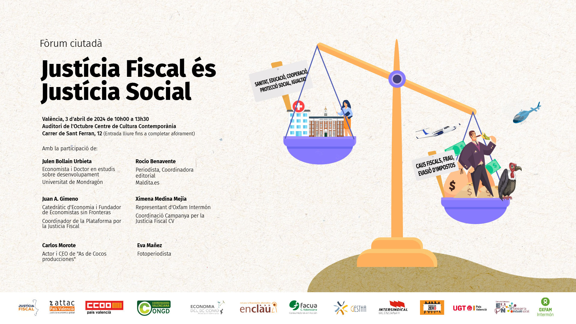 Des de la Campanya per la Justícia Fiscal de la Comunitat Valenciana organitzem el 3 d'abril el Fòrum ciutadà: Justícia fiscal és justícia social, amb els objectius de posar en valor la importància d’avançar cap a una fiscalitat que garantisca recursos per a sostindre l’estat de benestar de qualitat.