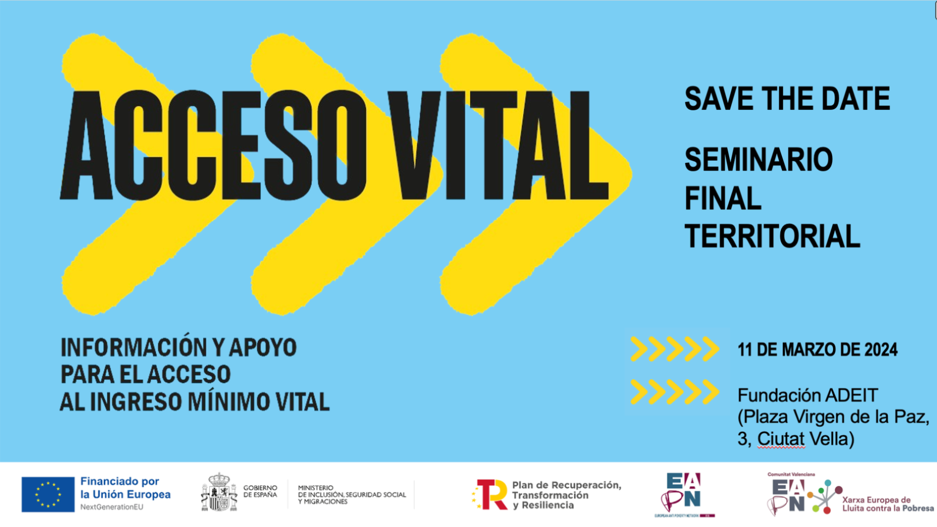 La EAPN Comunitat Valenciana i EAPN España han organitzat el Setmanari territorial de tancament del projecte Accés Vital que es durà a terme l'11 de març de 9 a 13.30 hores en Fundació ADEIT (Plaça Verge de la Pau, 3, Ciutat Vella)